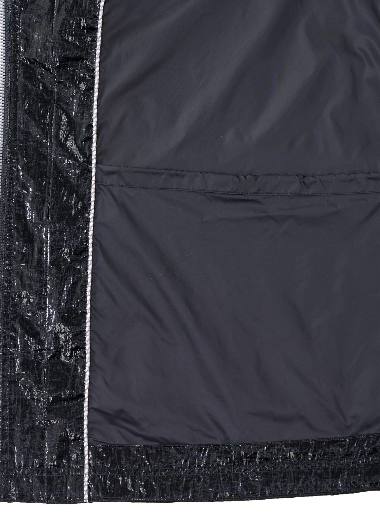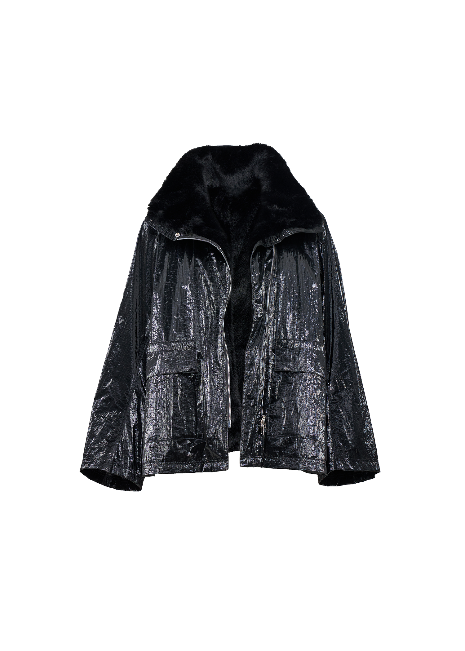 The Alectrona 3-in-1 jacket is a sophisticated A-line piece crafted from shiny nylon with a ripstop interior. Designed for versatility, it features a chic detachable faux fur lining, perfect for transitioning between seasons.