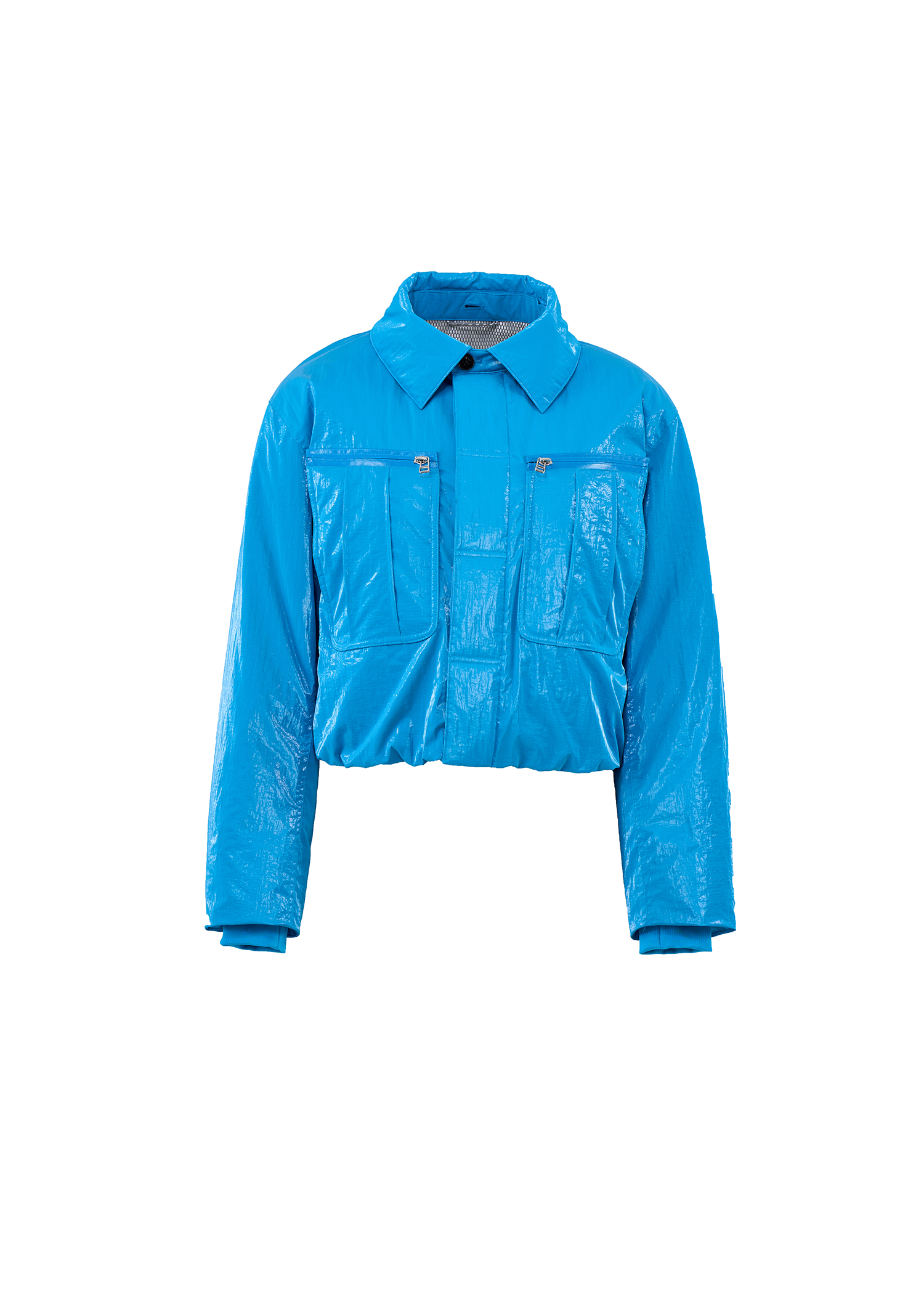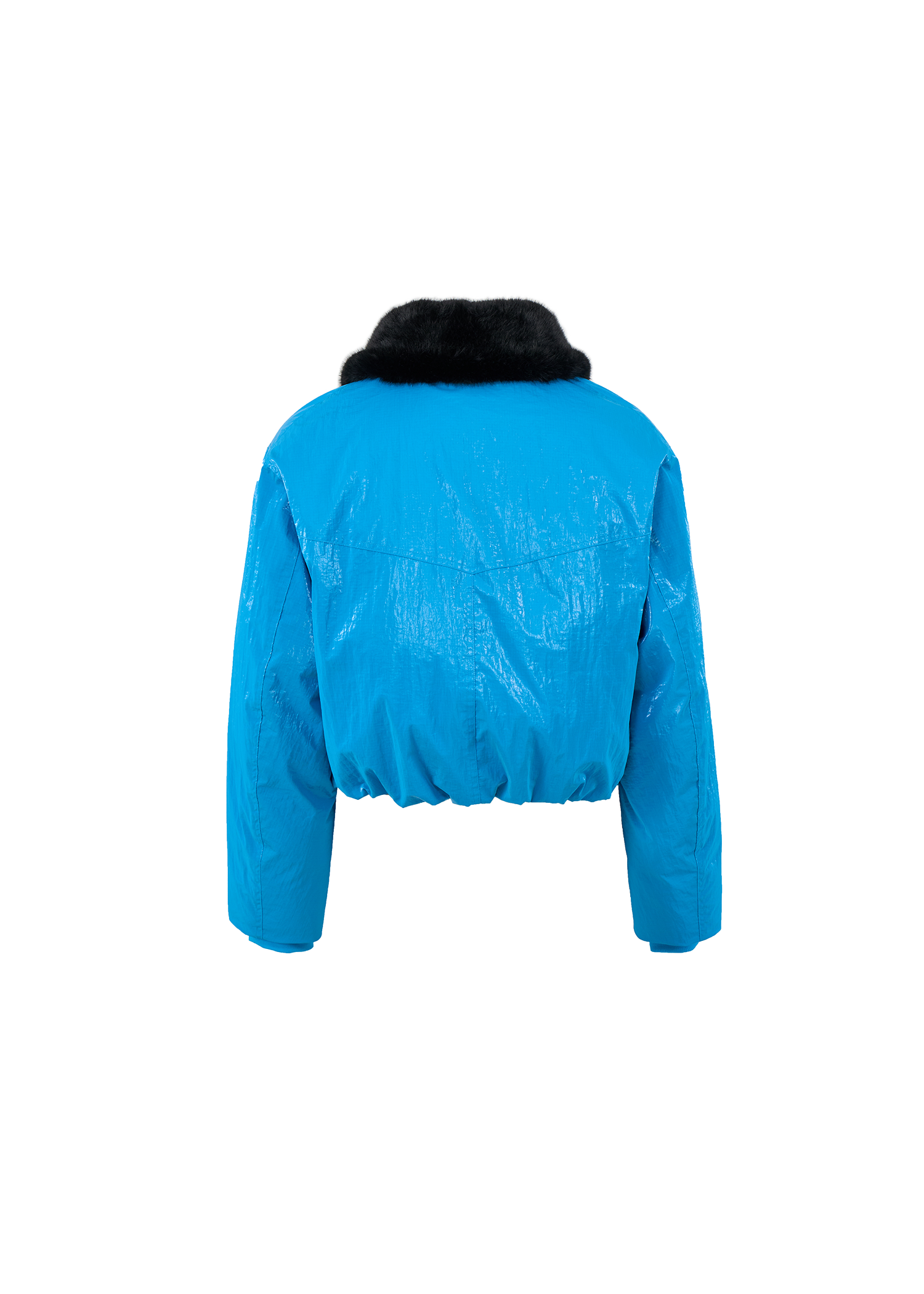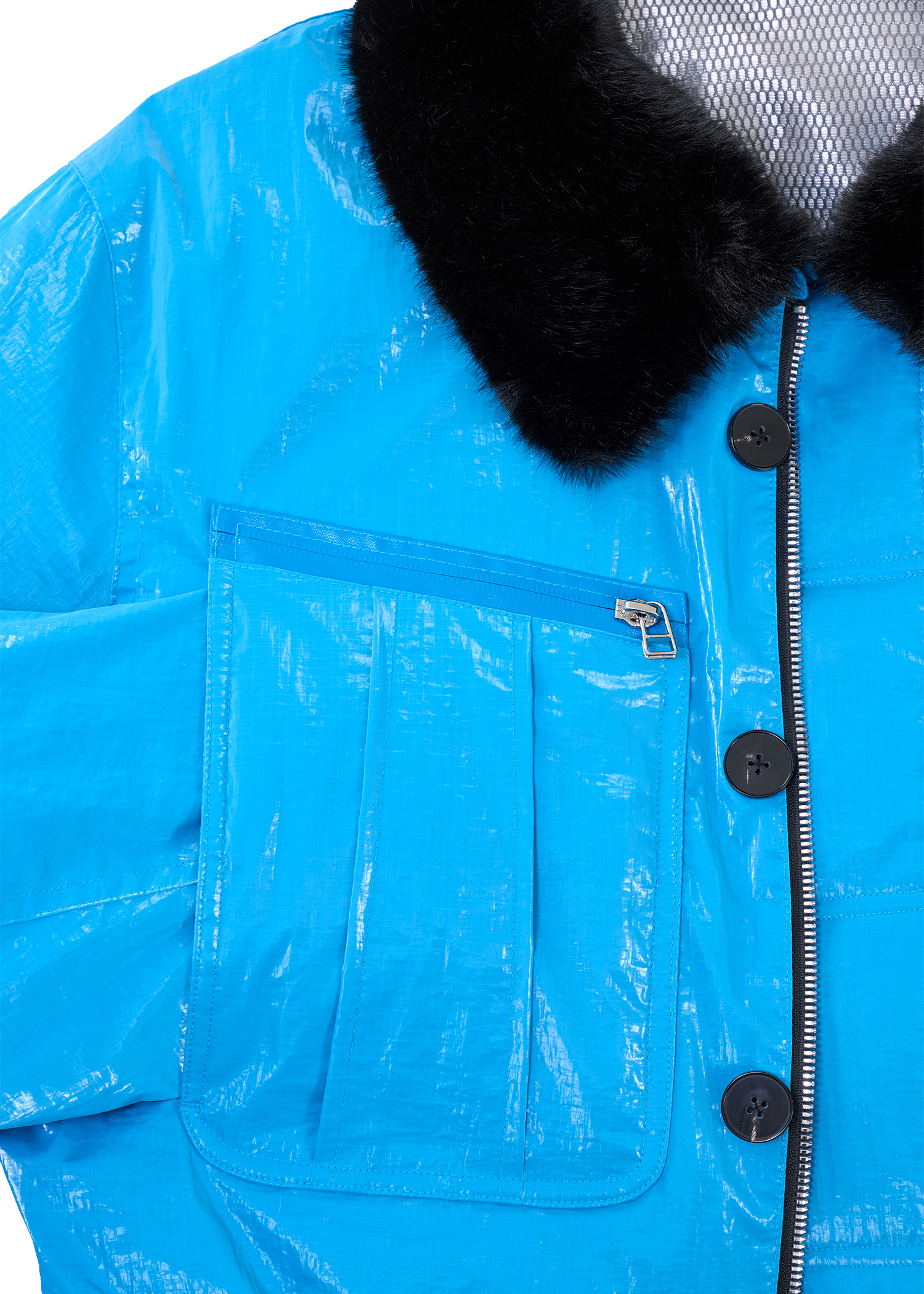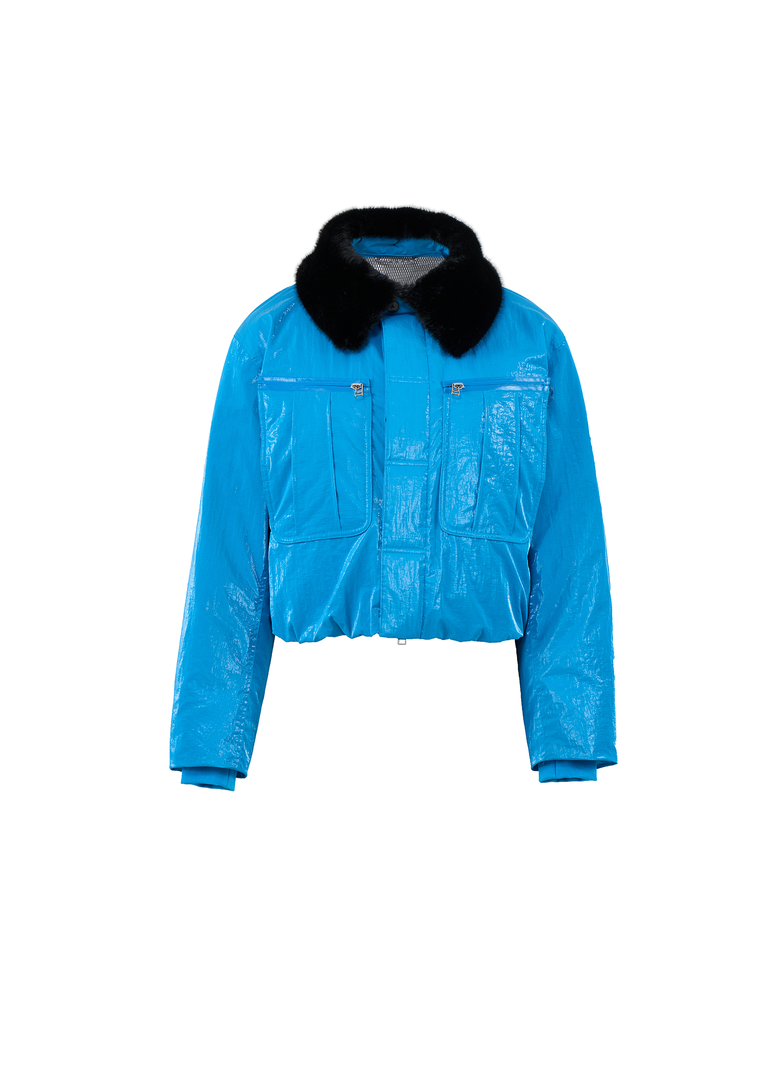 The Bia bomber jacket is a contemporary reimagining of the classic fisherman’s blouson. Made from shiny nylon, it features a detachable faux fur collar for versatile styling.