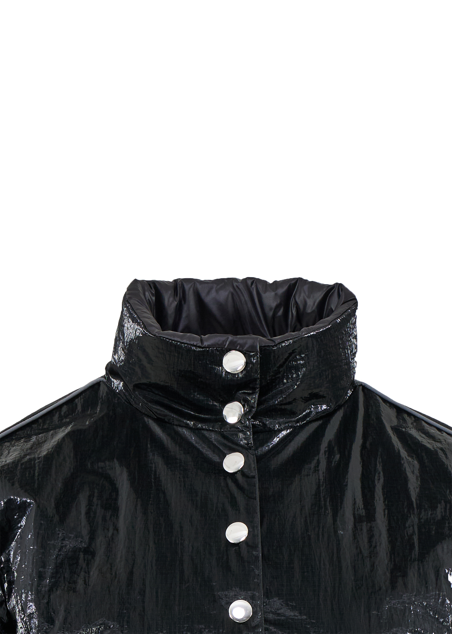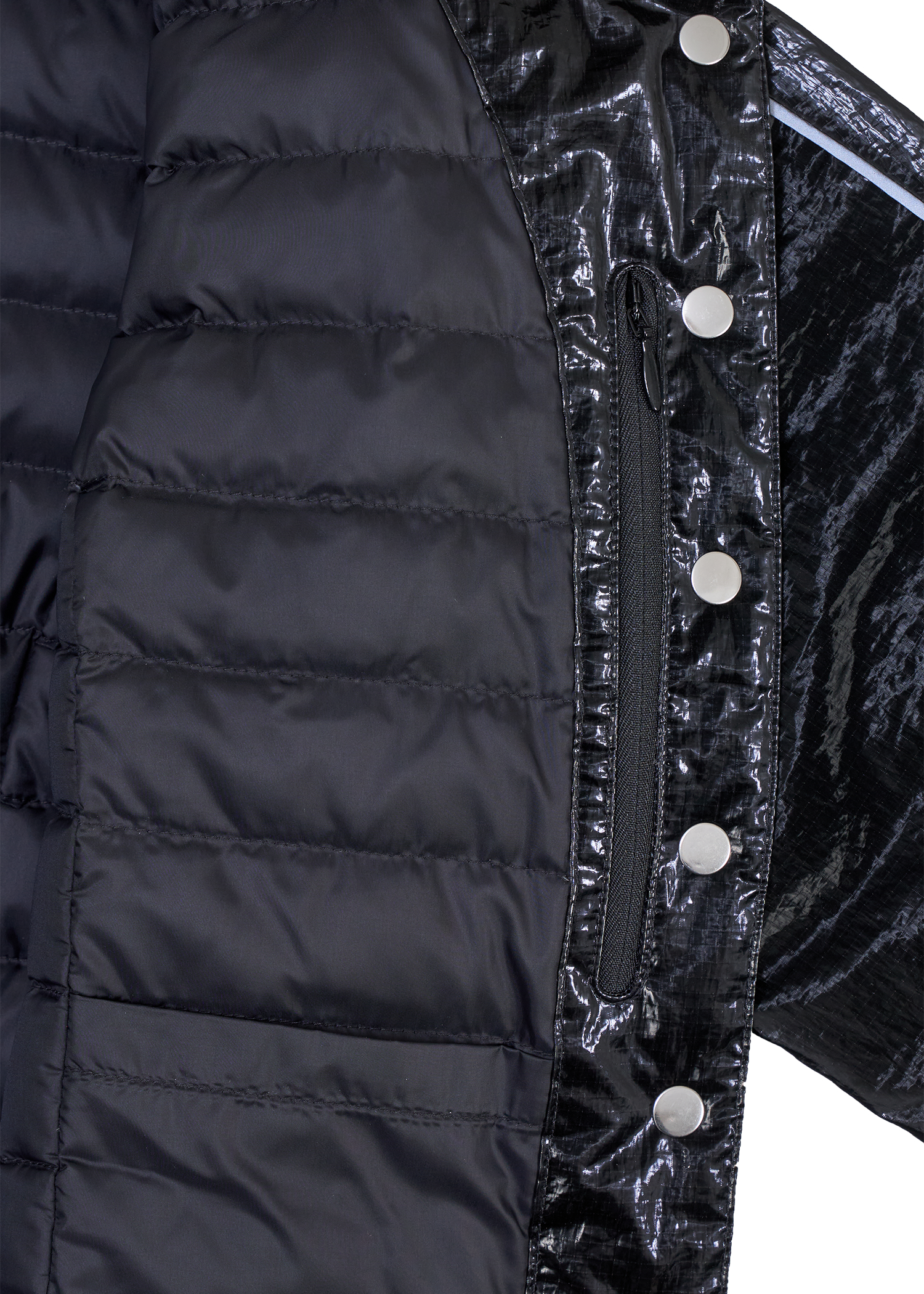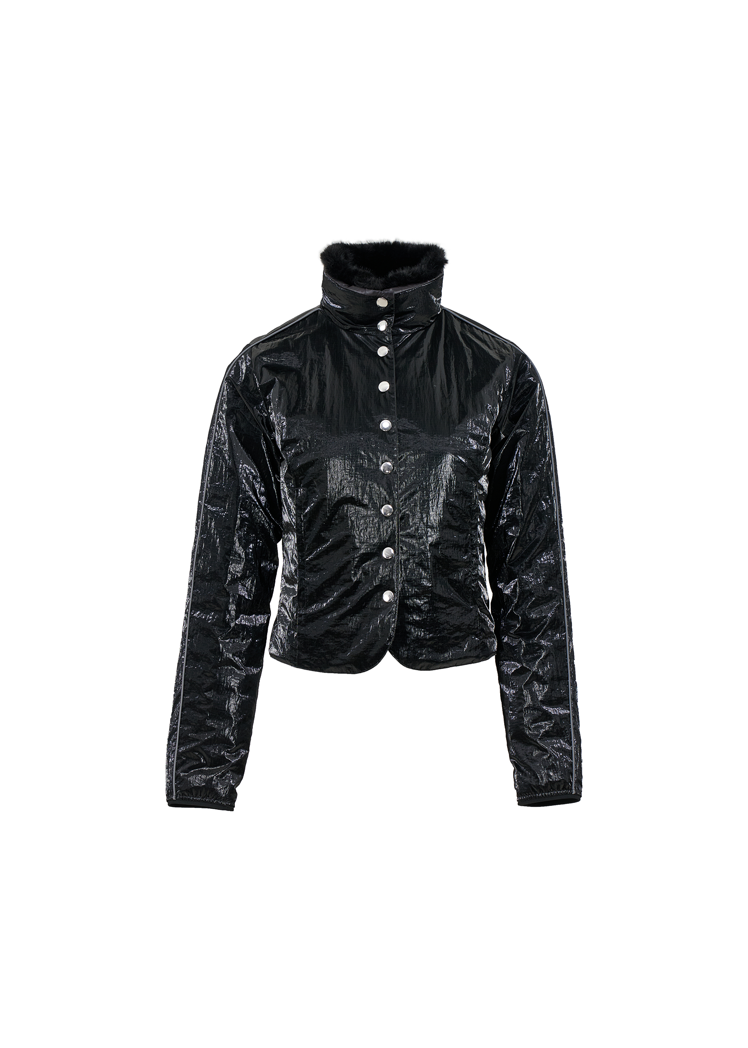 The Nyx jacket is a slim-fitting, lightweight down jacket features a snap-button closure, two exterior pockets, and a hidden interior pocket for added utility.